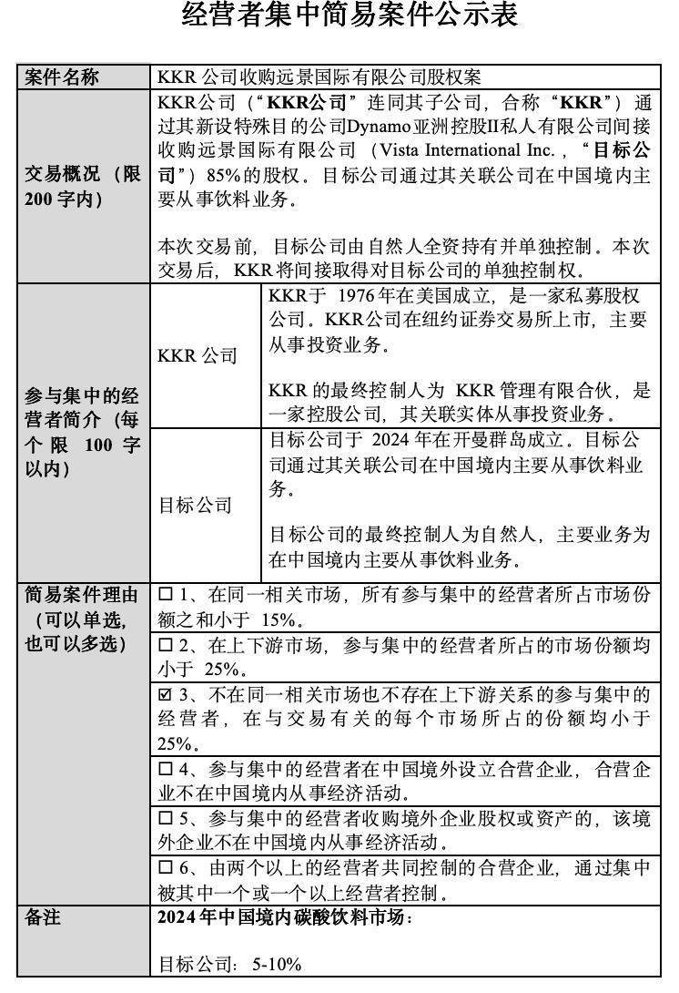 据重庆市市场监督管理局官网,KKR公司收购远景国际有限公司股权案公示:KKR通过其新设特殊目的公司Dynamo亚洲控股II私人有限公司,间接收购远景国际有限公司(Vista International Inc.,以下简称“目标公司”)85%的股权。目标公司通过其关联公司,在中国境内主要从事饮料业务。本次交易前,目标公司由自然人全资持有并单独控制。本次交易后,KKR将间接取得对目标公司的单独控制权。
