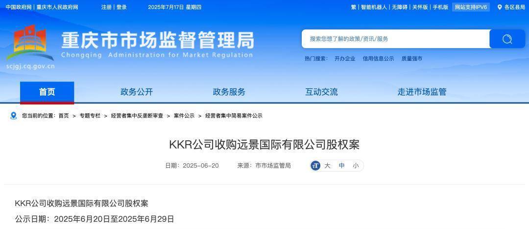 16日,市场监管总局发布的《2025年6月30日—7月6日无条件批准经营者集中案件列表》中显示,KKR公司收购远景国际有限公司股权案已于2025年7月4日办结。