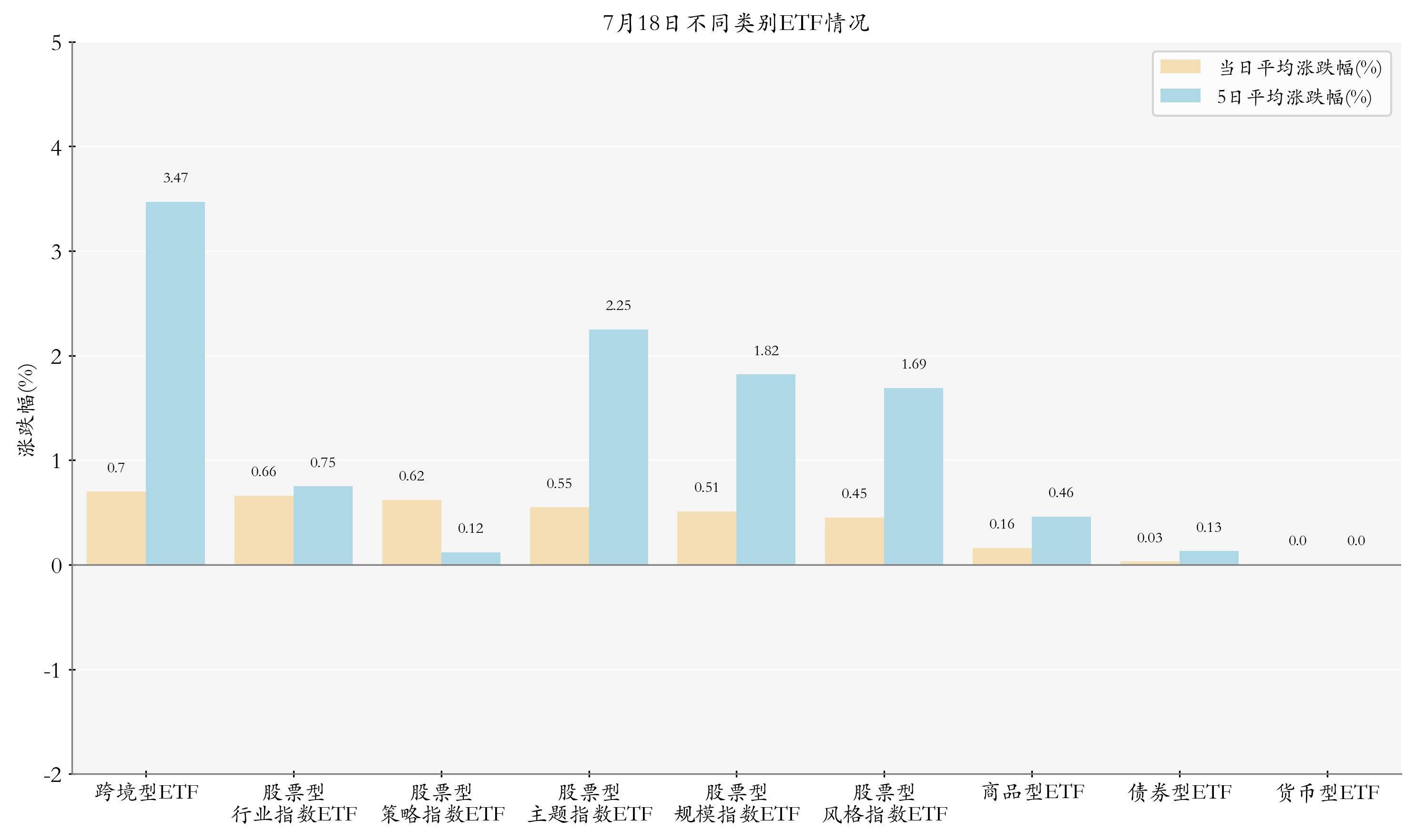 根据ETF基金的投资范围,将ETF基金划分为股票型规模指数ETF、股票型行业指数ETF、股票型策略指数ETF、股票型风格指数ETF、股票型主题指数ETF、债券型ETF、商品型ETF、货币型ETF、跨境ETF,今日跨境型ETF表现最优,该类ETF的平均涨跌幅为0.70%;货币型ETF的表现最差,该类ETF的平均涨跌幅为0.00%。