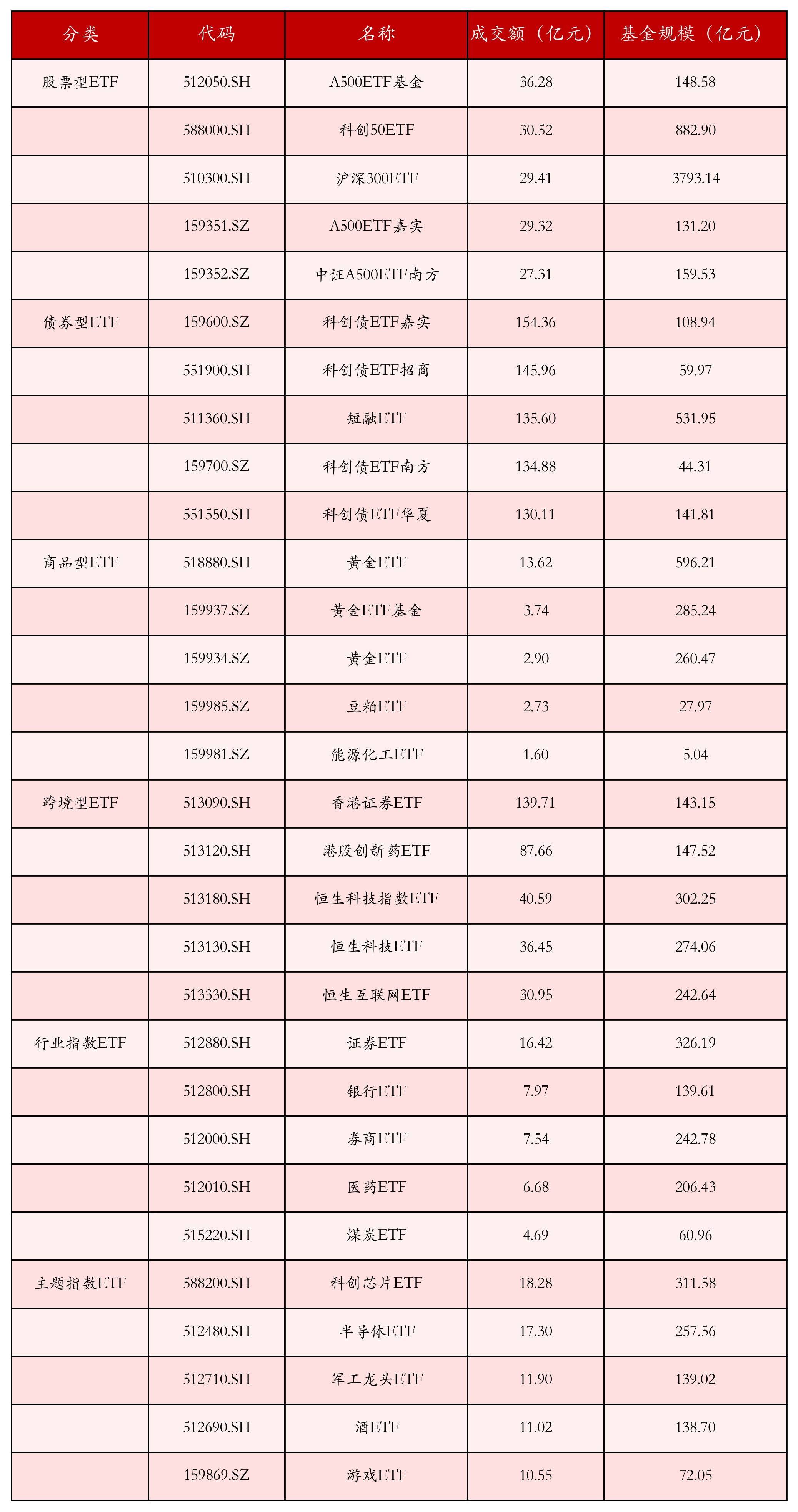 基于成交额对各类ETF今日的成交情况进行统计,成交额靠前的ETF产品如下表所示。股票型ETF中成交额排名前3位的ETF产品分别为A500ETF基金(512050.SH)、科创50ETF(588000.SH)和沪深300ETF(510300.SH),今日成交额分别为36.28亿元、30.52亿元和29.41亿元。