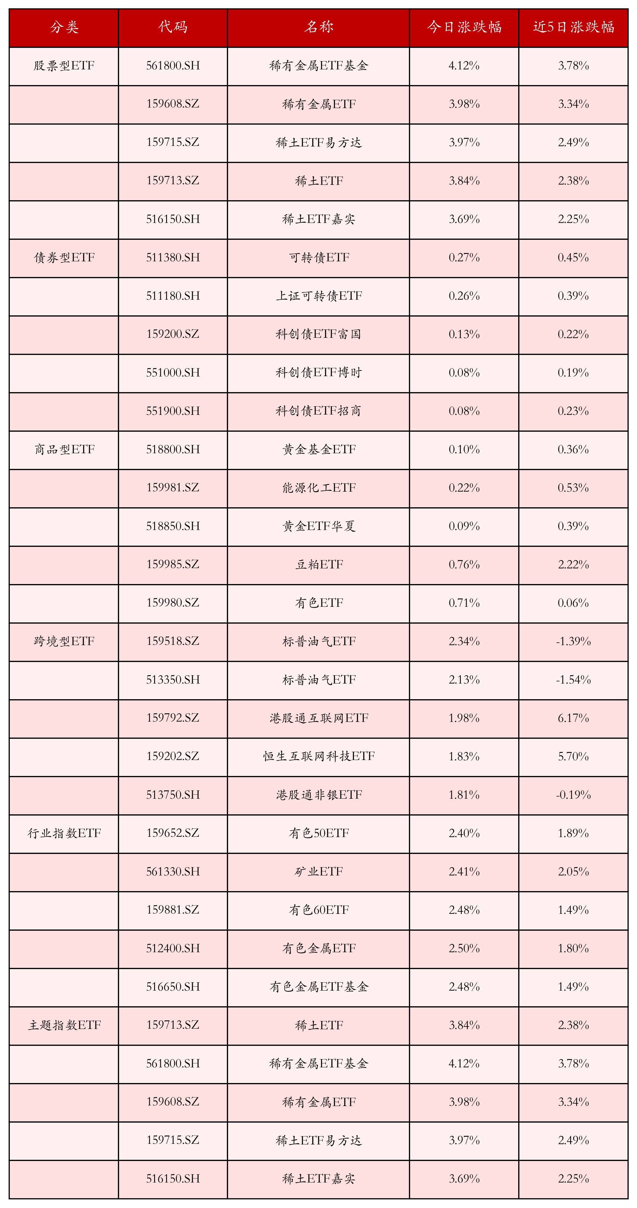 从不同投资种类、行业、主题的ETF产品中找出今日走势行情排名前5的ETF基金,今日涨幅靠前的ETF产品如下表所示。股票型ETF中涨跌幅排名前3位的ETF产品分别为稀有金属ETF基金(561800.SH)、稀有金属ETF(159608.SZ)和稀土ETF易方达(159715.SZ),今日收益率分别为4.12%、3.98%和3.97%。