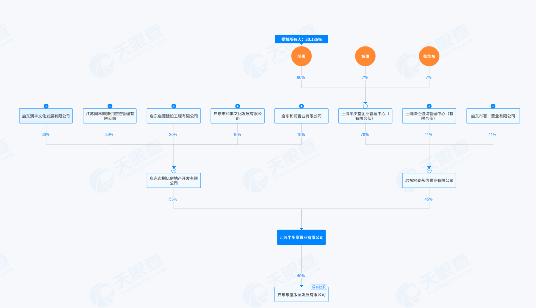 天眼查显示,江苏半步堂置业有限公司成立于2018年7月,注册地位于启东,公司经营范围包括房地产开发经营、文化艺术交流策划、企业管理咨询服务、物业管理服务、自有房屋租赁服务、停车场管理服务。陆勇是法定代表人,并且是董事长,同时还间接持有部分股份。